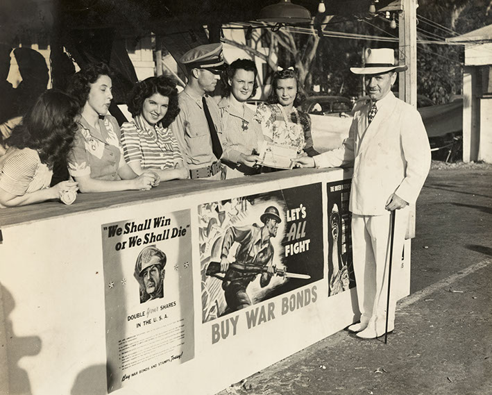 War saturated all aspects of civilian life. From rationing to leisure, the threat was at the forefront. Civilians were expected to be patriotic and to actively support the war effort. The U.S. government encouraged citizens to give 10% of their paychecks to purchase War Bonds, including bonds specifically funding construction of battle ships.