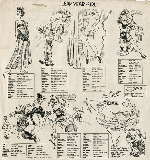 Society expected women to fit into stereotypical roles: the “American girl,” wife, mother, girlfriend, or sex symbol. Caricatured representations of these featured exaggerated traits and behaviors, including women desperate to get married. These depictions created a welcome distraction and amusement for soldiers, yet perpetuated unobtainable ideals for multifaceted women.