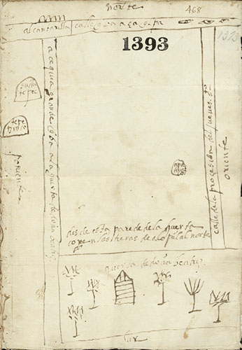 This map describes a transaction where land was donated by the indigenous people of Zacualpan to their patron or landowner Francisco de Solís. Interestingly, while the first parts of the document’s text are written in Spanish, other parts are written in Nahuatl, the indigenous language of the Aztecs. This could be an indication that both the Spanish officials and the indigenous people involved contributed to the document. Therefore, it could be just as likely that this map was done by an indigenous hand. The land is represented as a geometric space, with streets bordering it, and the cardinal directions indicated on the page’s sides. The artist also included small drawings of trees and what appears to be a house structure.