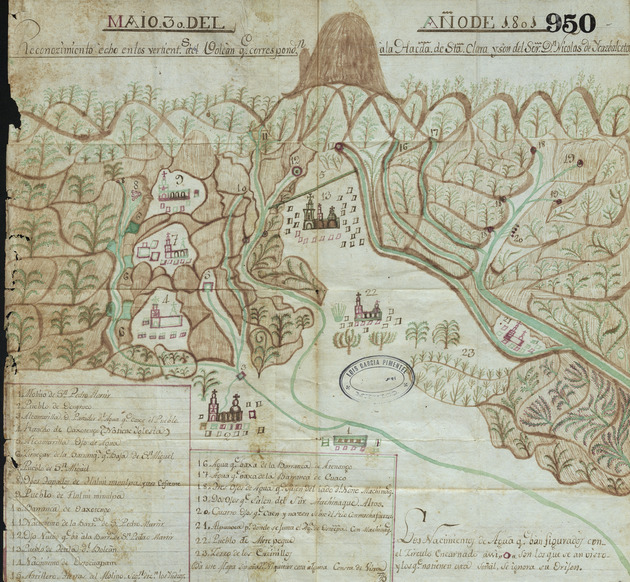 This document brings forth established decrees between the hacienda owners of Santa Ana Tenango and Santa Clara de Montefalco. The included map included is unique in its depictions of nature, representation of geographical features, including a volcano, and the use of color. Moreover, parts of this map seem to be illustrated with watercolors. The map also points out significant towns and landmarks with number labels and a key. For example, close to the center of the map, one finds a small drawing of a cathedral with small squares around it. The number thirteen is written beside it and the key at the bottom of the page indicates that it is a representation of the “Pueblo de Tetela del Volcan." This map is clearly not a representation of reality, but it does show the artist’s thoughts about land. Similar to the Codex Resse, importance is placed on plants and bodies of water rather than on space and property.