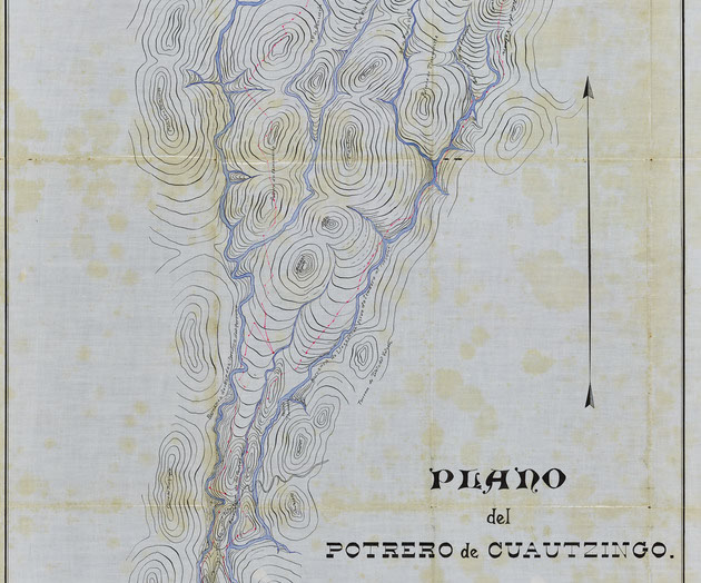 This map is part of a twenty-nine page document that goes over the allocation of a “potrero” or a pastureland titled Cuautzingo located in the state of Morelos. This type of work is known as a topographic map and, with the use of contour lines, it shows and represents the points of elevation of the land. Labels rendered in black ink point out the distinct geographical formations of the land. Additionally, black lines at the top of the map connect to form a triangle to indicate the divisions and land properties of individuals in the area. Red lines are also seen and seem to outline significant land areas. The artist emphasized the land’s elevation and height, as well as its naturally made features